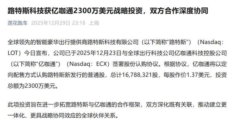12月29日晚,莲花跑车发布了一则获得战略投资的公告。公告内容显示,公司已于2025年12月23日与全球出行科技公司亿咖通科技控股公司(以下简称“亿咖通”)(Nasdaq:ECX)签署股份认购协议。根据协议,亿咖通将以定向配售方式认购路特斯新发行的普通股,总计16,788,321股,每股作价1.37美元,投资总额为2300万美元。