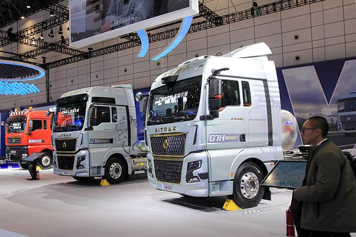 除了那个蜚声海外的黄河车,现场的明星产品还有很多。比方说斩获“年度智能网联牵引车”“高效创富先锋”等九项行业大奖的汕德卡C9H、豪沃TH7-N;再比方上市即热销的旗舰产品汕德卡G7H 720马力燃气牵引车……