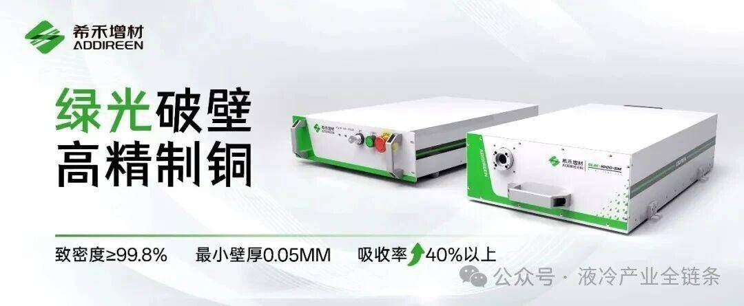 希禾增材自主研发的绿光激光器,将铜的吸收率提升至40%以上,是传统红外激光的8倍,从根本上解决了这一制造难题。凭借绿激光核心技术,希禾增材实现了高精度、高致密度的纯铜打印,打印件最小壁厚可达0.05mm,致密度超过99.8%,为微通道液冷板等高端应用奠定了制造基础。