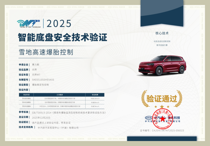 12月30日,中汽中心正式公布2025冬季测试结果,全新问界M7(参数|询价)在极端低温环境下表现卓越,荣获“综合性能类验证”及“智能底盘安全技术验证”两大权威证书,彰显出车辆在极寒环境下的整车可靠品质与安全实力。