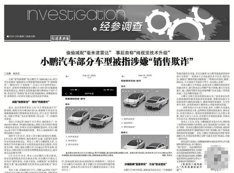 12月30日《经济参考报》再次点名批评小鹏汽车,揭露其部分车型存在偷偷减配“毫米波雷达”,却事后自称“纯视觉技术升级”的问题,直指其涉嫌“销售欺诈”。