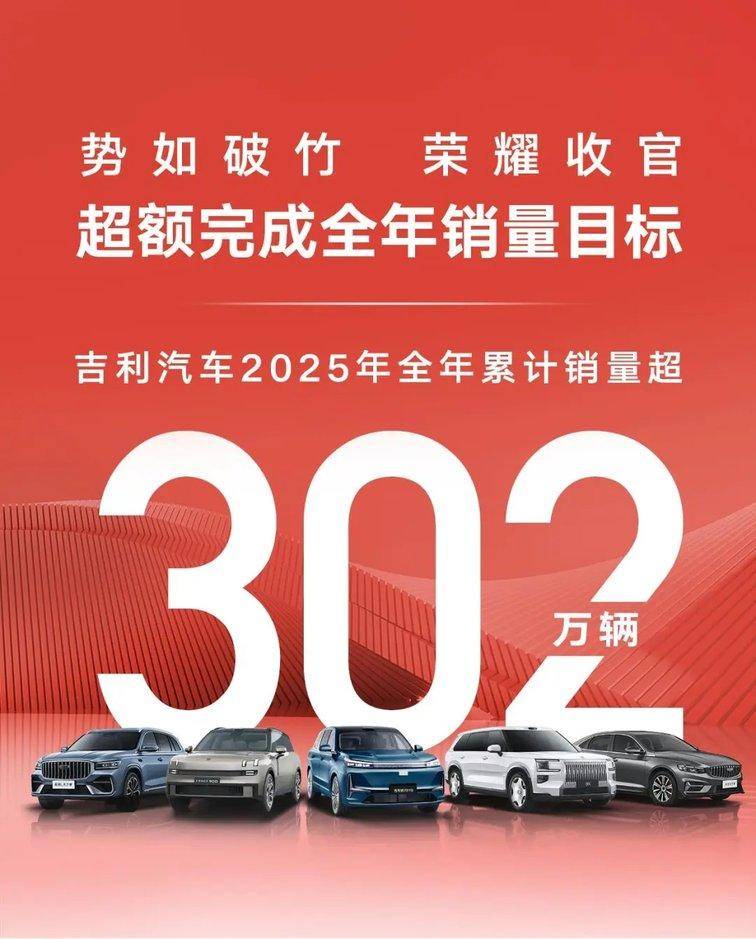 第四名,吉利汽车,12 月销量23.68万辆,同比增长13%,全年302.46万辆超额完成目标,同比大增 39%,2026年销量目标345万辆,其中新能源目标222万辆。