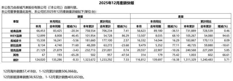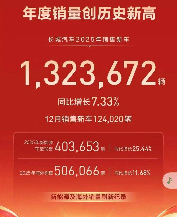 第五名,长城汽车,12 月销量12.40 万辆,同比下滑 8.33%。2025年全年销量1323672辆,同比增长7.33%。其中全年新能源销量403653辆,同比增长25.445;海外销量506066辆,同比增长11.68%。