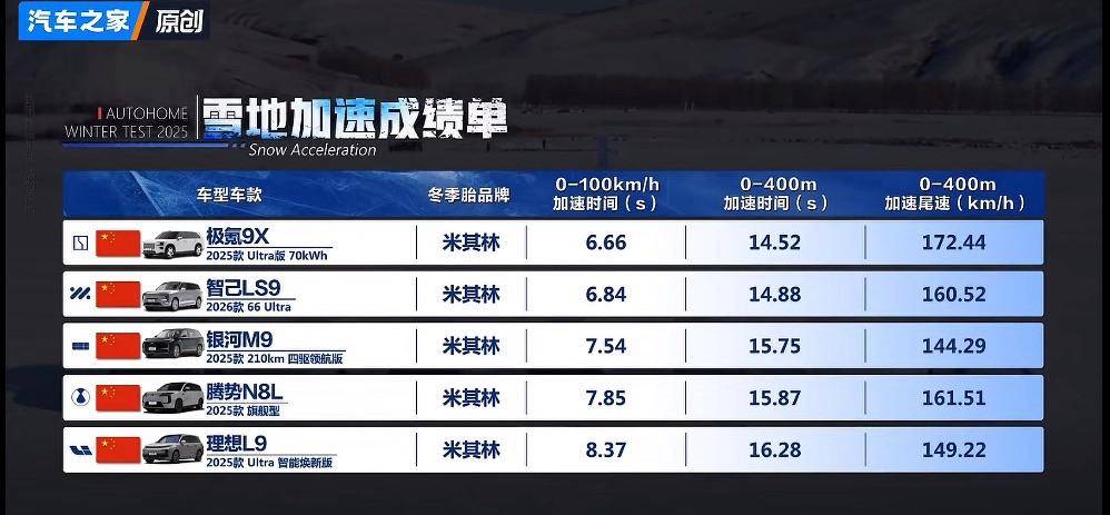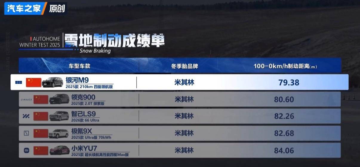 最后是 “全场景验证” 的安全闭环。其实,银河 M9 早已构建起行业最全面的爆胎测试体系,更是覆盖了雪面、冰面、沥青、湿滑路面等全场景,以及直线、弯道、三车并行等复杂工况,此次雪地弯道爆胎测试只是其安全验证的一个缩影。而在此前某媒体冬季实测中,面对 50 款竞品车型,银河 M9也成为了唯一一款雪地制动每次都能刹入 80 米的车型,同时跻身雪地加速榜前三,用 “实测数据” 印证了其动态性能与安全可靠性的双重优势。