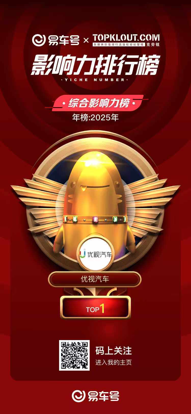 在刚刚揭晓的「易车号2025年度综合影响力榜」中,优视汽车荣登榜首,拿下第一名!
