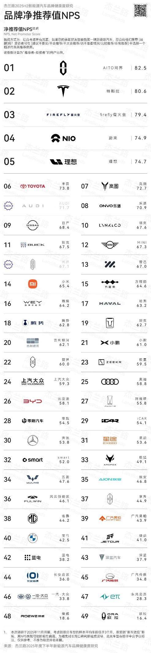 近日,杰兰路咨询发布《2025下半年新能源汽车品牌健康研究报告》。报告显示,问界荣获品牌NPS(净推荐值)第一、品牌发展信心指数第一、30万元以上品牌百人青睐指数第一;问界旗下“双旗舰王牌”,再添口碑佳绩:全景智慧旗舰SUV问界M9荣获车型NPS (净推荐值) 第一,家庭智慧旗舰SUV问界M8首次参评即荣获NPS (净推荐值) 第二。这一系列亮眼成绩,无不彰显问界在高端新能源赛道的引领地位。