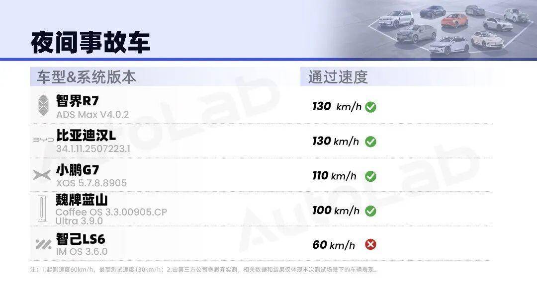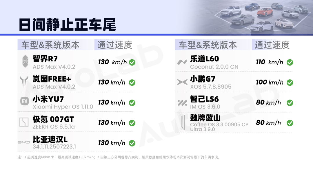 先把各车在各个场景下的测试结果给到大家。
