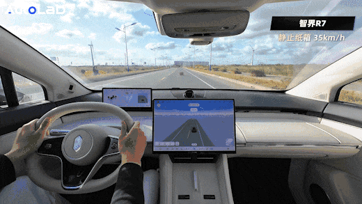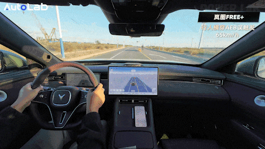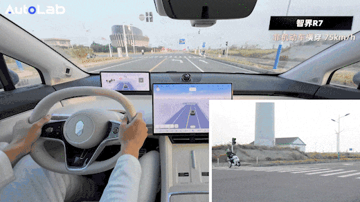 这个场景中两个使用ADS的车型,智界R7和岚图FREE+同时做到了75km/h刹停,并且他们在刹车避开横穿的非机动车后,会释放刹车进行缓行,防止后车追尾。