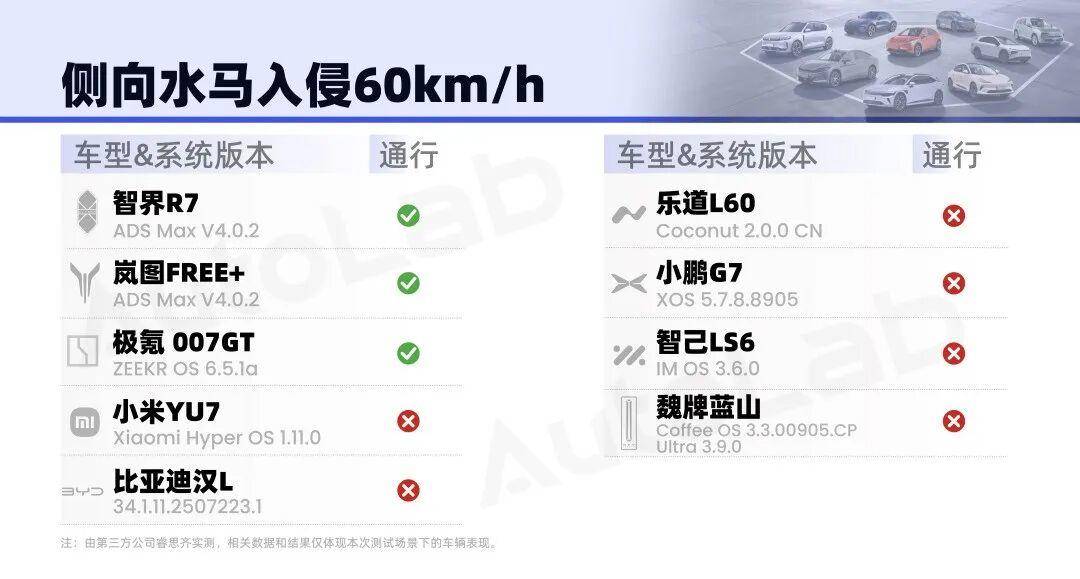 在这个场景中,乐道L60和魏牌蓝山没能通过这个基础的安全测试。