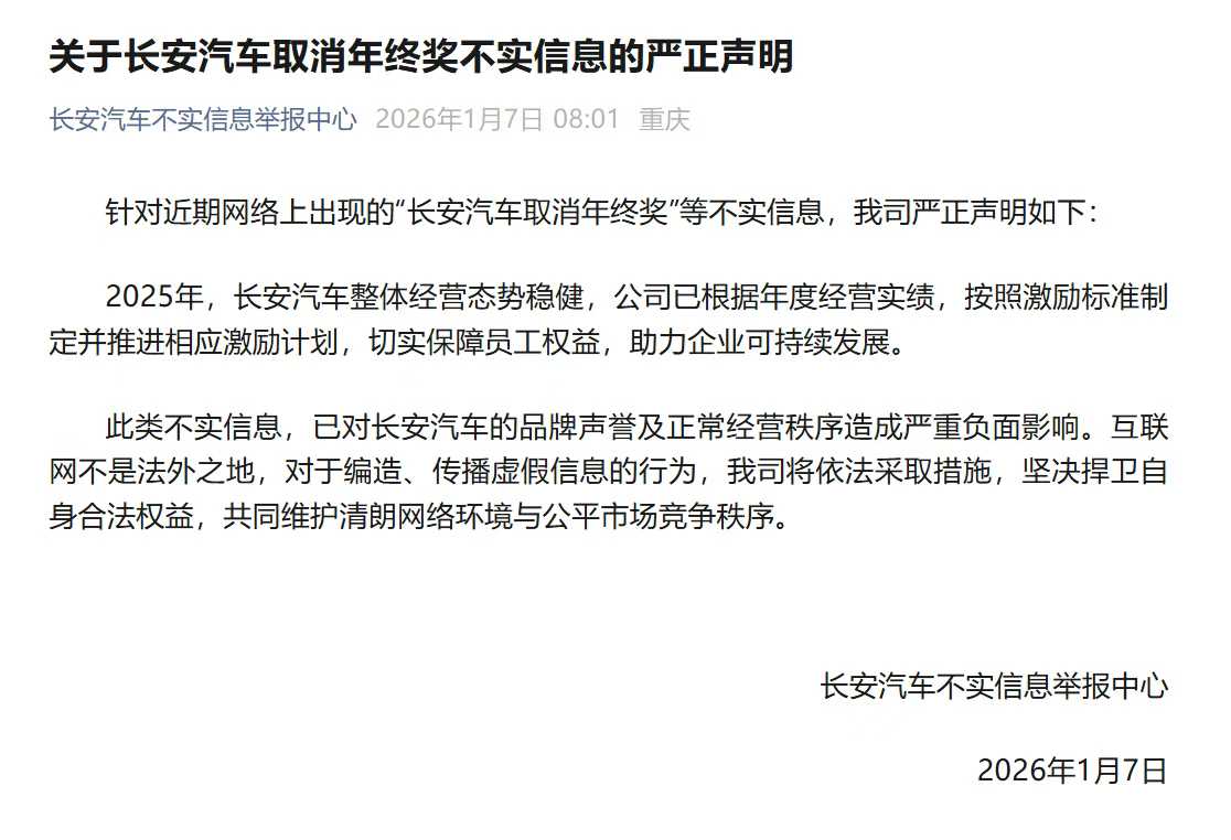 网传“长安汽车取消年终奖”?官方回应来了!2025年公司整体经营态势稳健,已按年度实绩制定并推进激励计划,员工权益妥妥保障。造谣传谣?互联网不是法外之地,长安汽车将依法维权,守护清朗网络环境!#长安汽车硬核辟谣 #年终奖真相在这里