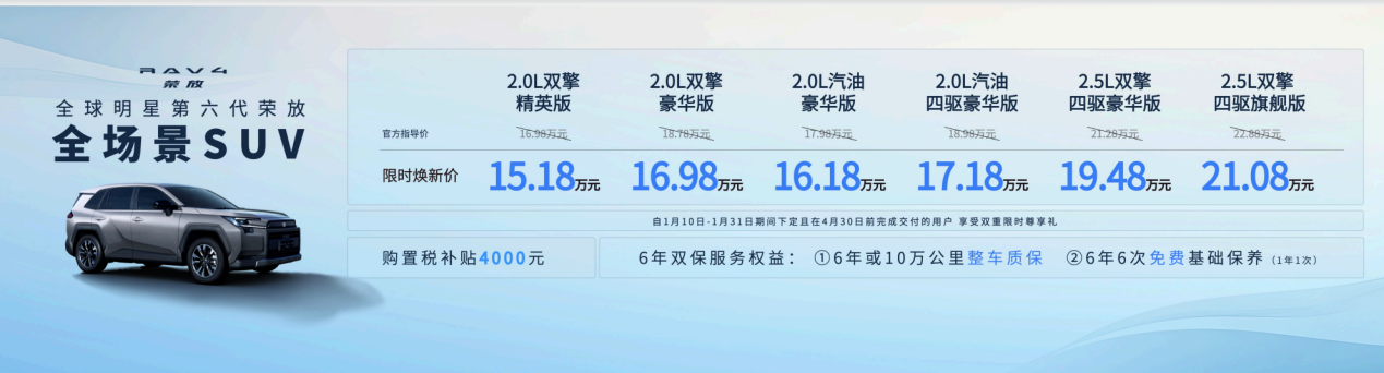 全能担当全新荣放,作为本次交付的主角,其官方价格区间为16.98万元-22.88万元,限时焕新价15.18万元-21.08万元。1月10号-1月31日期间下定且在4月30日前完成交付的用户,即可享受4000 元购置税补贴+ 6年双保服务权益,实惠满满,诚意十足。