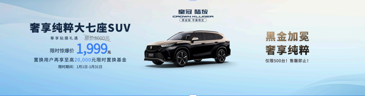 旗舰典范皇冠陆放,对追求高端品质的用户,特别推出黑金版尊享贴膜礼遇。价值8000元的原厂高品质隔热膜,限时专属秒杀价仅1999元,限量前500名订车用户,先到先得,奢华感受再次升级。同时,在1月1日到1月31日期间置换的用户,额外再享至高2万元限时置换基金。