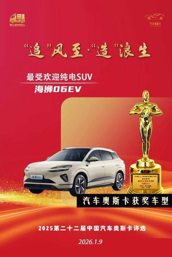 获奖理由:出色实力与超高人气兼备,海狮06EV以卓越续航、先锋科技与实用空间,重新定义了中型纯电SUV的价值标杆,获此殊荣实至名归。