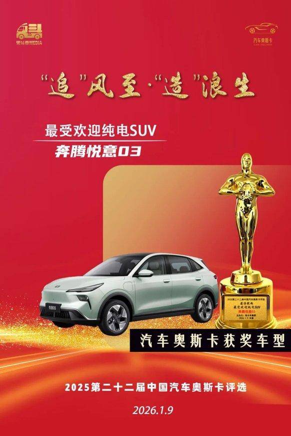 获奖理由:奔腾悦意03凭借大空间、大续航、大厂造三大核心优势,赢得数万家庭用户的青睐,成为家庭纯电出行品质首选。