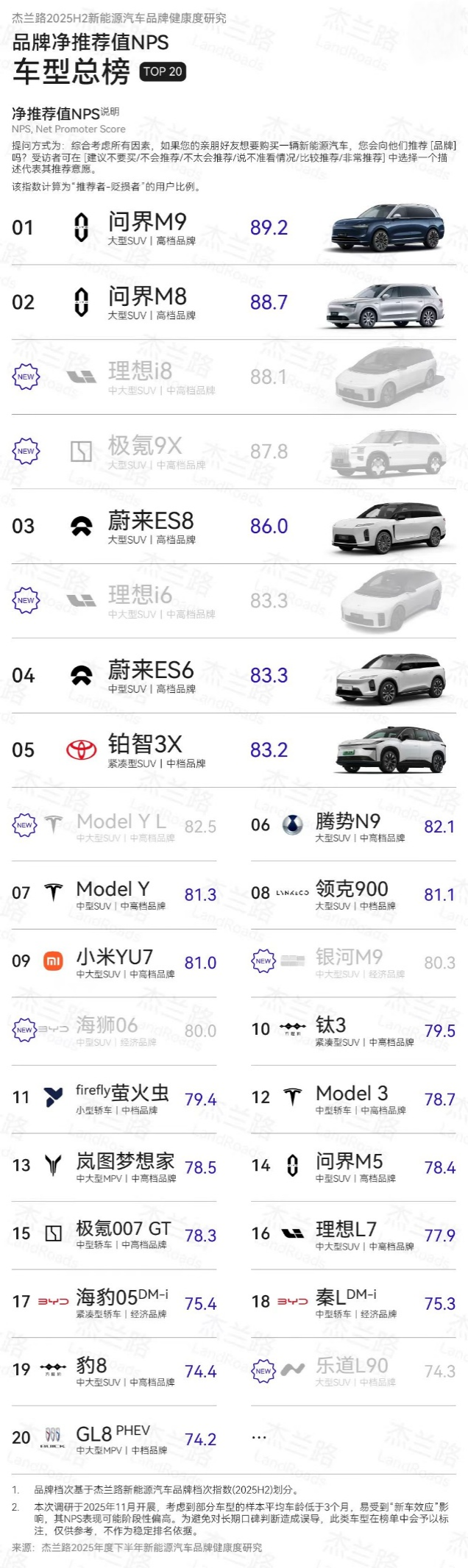 近日,杰兰路最新发布的《2025年度下半年新能源汽车品牌健康度研究》报告显示:问界一举斩获品牌NPS(净推荐值)第一、品牌发展信心指数第一、30万元以上品牌百人青睐指数第一;旗下双旗舰车型更再创佳绩——全景智慧旗舰SUV问界M9连续四次斩获车型NPS(净推荐值)第一,家庭智慧旗舰SUV问界M8首次参评即跻身车型NPS(净推荐值)第二。这份成绩单既彰显出市场对问界的高度认可,更印证了其在高端新能源赛道的引领地位。