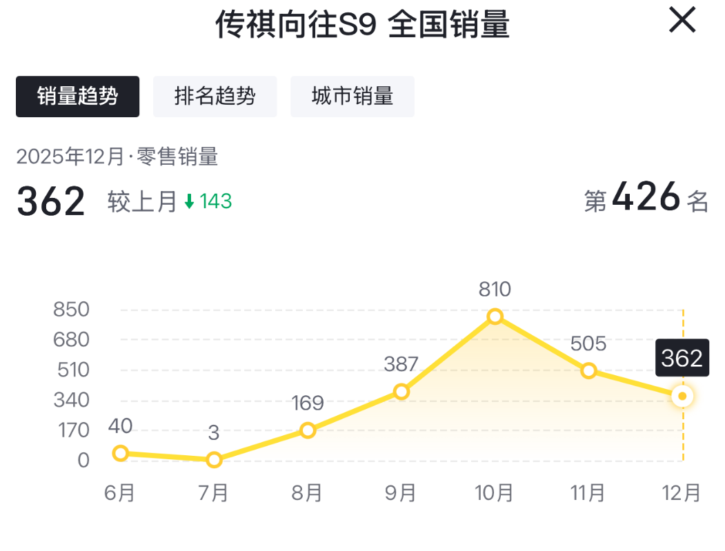 行业综合销量数据显示,2025年9月-12月份,向往S9的单月零售销量分别为387台、810台、505台、363台。