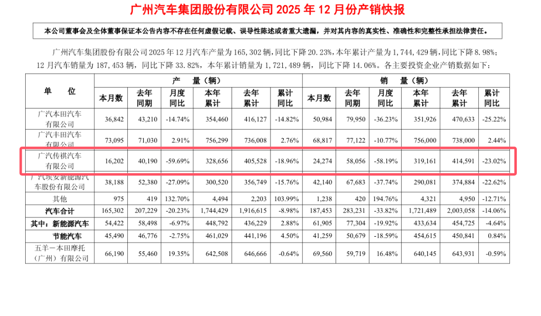 曾经在国内车市表现优异,广汽传祺却在2025年交出了一份全年销量下滑23.02%、12月同比暴跌58.19%的成绩单。