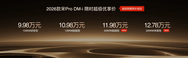 此次,2026款秦PLUS DM-i三款车型售价7.98万元-9.98万元;2026秦L DM-i四款车型限时超级优享价9.28万元-12.28万元;2026款宋Pro DM-i限时超级优享价9.98万元-12.78万元。