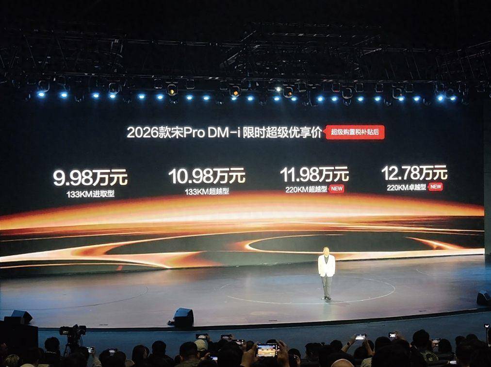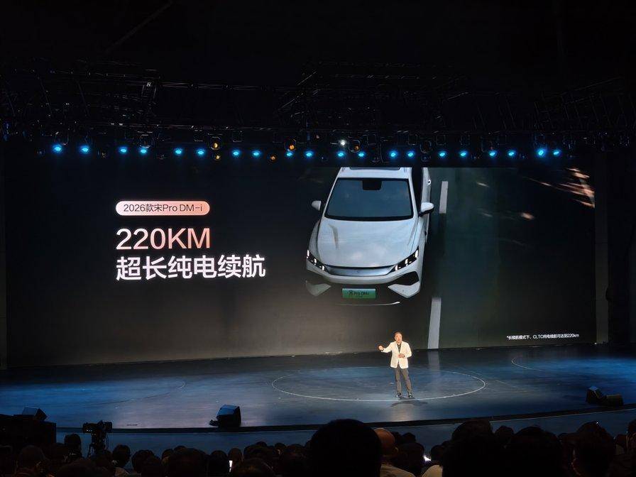 【车媒体丨新车】2026年1月10日,深圳比亚迪总部,2026款宋Pro(参数|询价) DM-i 220km长续航版正式上市,炸响了2026年的行业惊雷,当屏幕显示出“限时优享价9.98万元起”时,现场爆发出持续掌声。CLTC纯电续航提升至220公里,这个数字不仅刷新了长续航插混SUV的价格纪录,更意味着比亚迪开启了10万以内家用SUV的长续航平权时代。