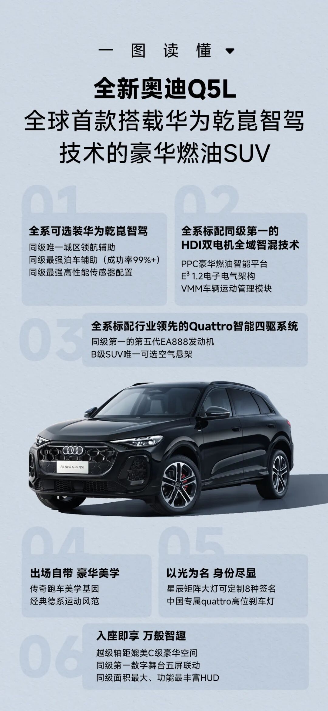 2026年1月15日,在华为乾崑与一汽奥迪合作推出的另一款车型——一汽奥迪全新Q5L,即将可全系搭载乾崑智驾系统。
