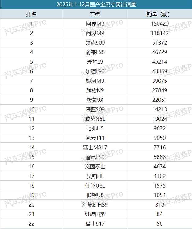 从全年销量来看,今年4月份上市的问界M8成为国产全尺寸的大赢家,其2025年累计热销150420辆,成为2025年国产全尺寸SUV销量冠军;同品牌的问界M9以118142台辆的成绩拿下亚军,在这个细分市场,也仅有这两台车年销超过了10万台。