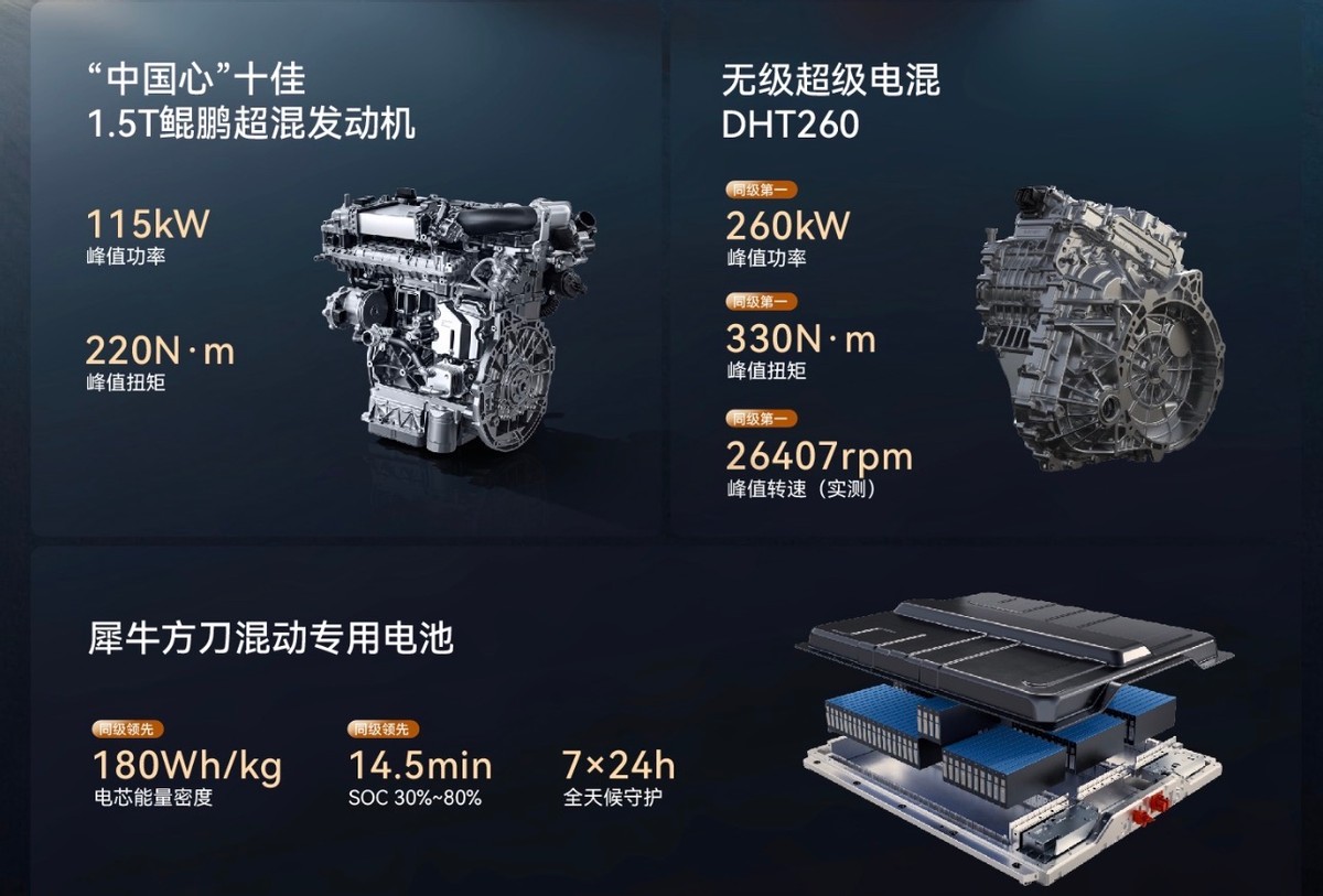 动力和续航才是插混车主最关心的,风云T9L搭载的鲲鹏超能电混CDM系统,1.5T发动机热效率高达45.79%,配合DHT260超混变速箱,综合功率260kW,四驱版零百加速能进5秒级,高速超车一点不费劲。最关键的是续航,提供两种电池版本,长续航版工信部纯电里程170公里,咱们日常通勤每天几十公里,一周充一次电完全够用,标准版本纯电续航也有101公里,适合通勤距离更纯电模式开着又静又省。馈电油耗才3.9L,比很多燃油车都省油,跑长途也没有什么续航焦虑。