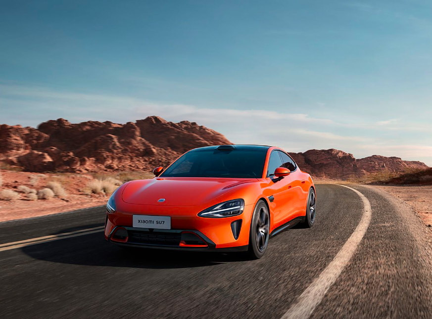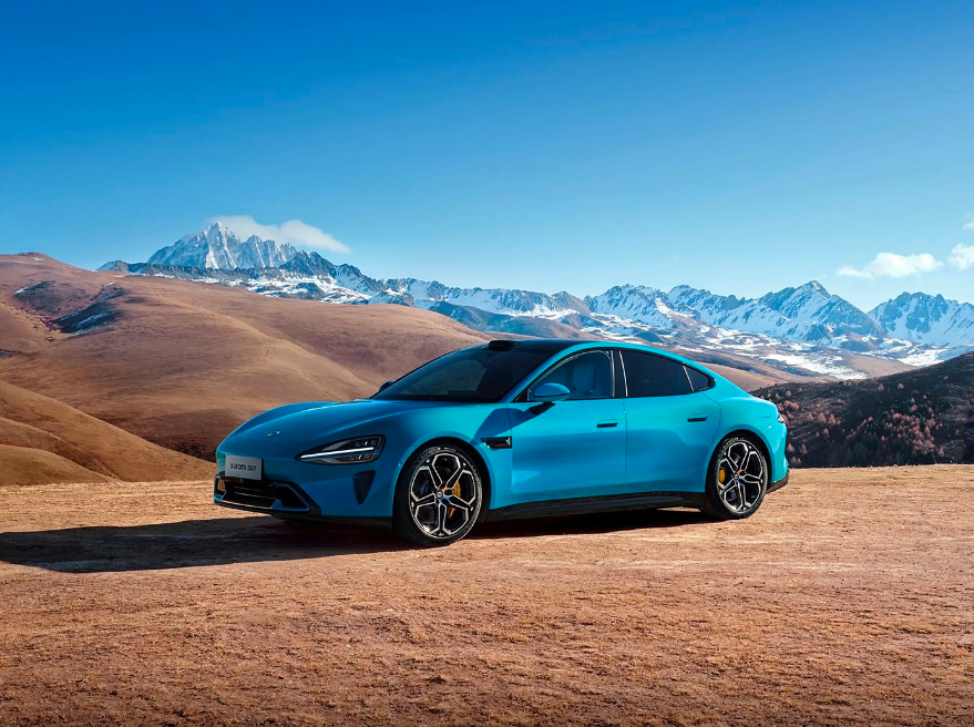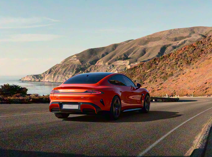 小米SU7采用经典跑车线条,水滴形大灯与360颗LED组成的光环尾灯相互呼应,优雅灵动的车身线条勾勒出动感姿态,半隐藏式门把手、无边框水滴后视镜等设计,增添了车辆的时尚感。尾部顶端的鸭尾式造型与可升降主动尾翼,优化了空气动力学性能。