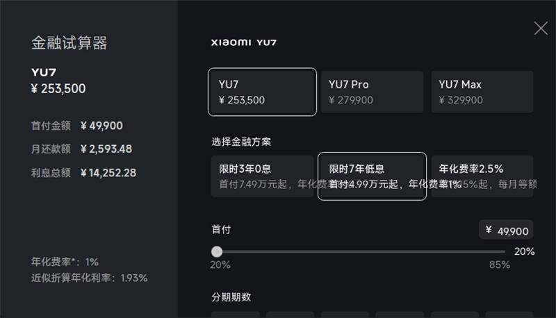 最新的消息是,小米汽车也推出了7年低息方案,似乎是瞄准了特斯拉,针锋相对。以指导价25.35万元的YU7为例,首付4.99万元,分期84个月,月供2593元,7年总利息大概1.4万元,年化费率约1%。从这里我们就能看出,特斯拉的7年“超低息”,的确是比小米汽车的7年“低息”更低的,特斯拉7年总利息还不到小米的一半。