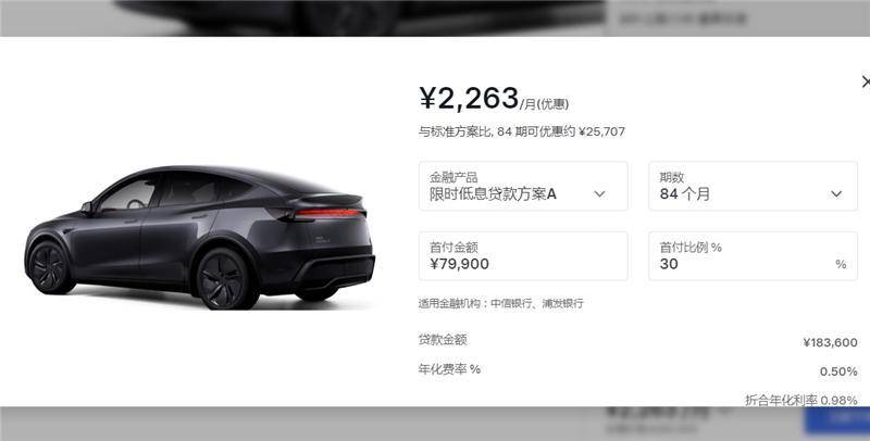 而同样热销,且早早就给出3年0息甚至5年0息方案的特斯拉,在小米推出3年0息活动之后,更是新推出一个让人觉得有些夸张的7年超低息方案,特斯拉Model 3、Model Y、Model Y L均可参加此活动,以指导价26.35万元的Model Y为例,首付7.99万元,分期84个月,月供2263元,七年总利息不到6500元,折算下来年化费率约0.5%,这是相当低的,的确称得上是超低息。