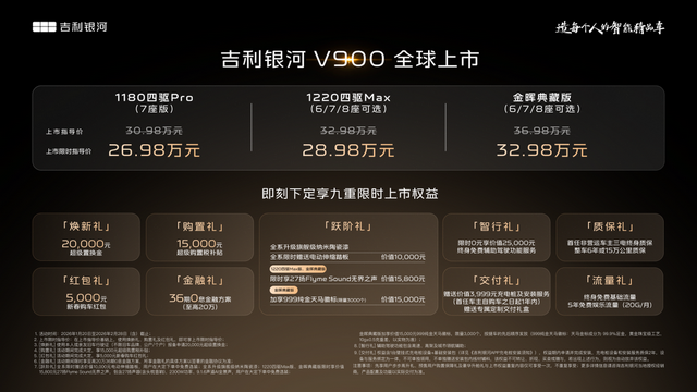 1月20日,吉利银河豪华V系列首发之作,“AI全场景家庭旗舰MPV”——吉利银河V900正式上市,共推出3个车型,上市限时指导价26.98万元-32.98万元。即日起,用户可通过吉利银河APP、微信小程序、抖音小程序及官网等官方渠道下订,下订即享焕新礼、购置礼、红包礼、金融礼、智行礼、质保礼、交付礼、流量礼、跃阶礼九重购车好礼,超高价值,一次满足,诚意拉满。