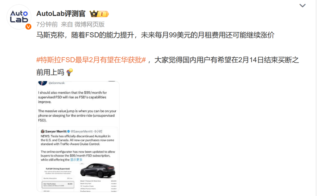 马斯克今天在论坛上表示:满血版的FSD最快下个月就能进入中国内地。