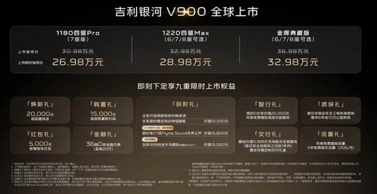 车评社讯 1月20日,吉利银河V900正式上市,新车共推出3款车型,上市限时指导价26.98万元-32.98万元。从产品划分来看,吉利银河V900属于吉利银河V系列首款旗舰车型,该车定位为“AI全场景家庭旗舰MPV,可见家庭及商务是兼具的,那么这款车实力究竟如何?