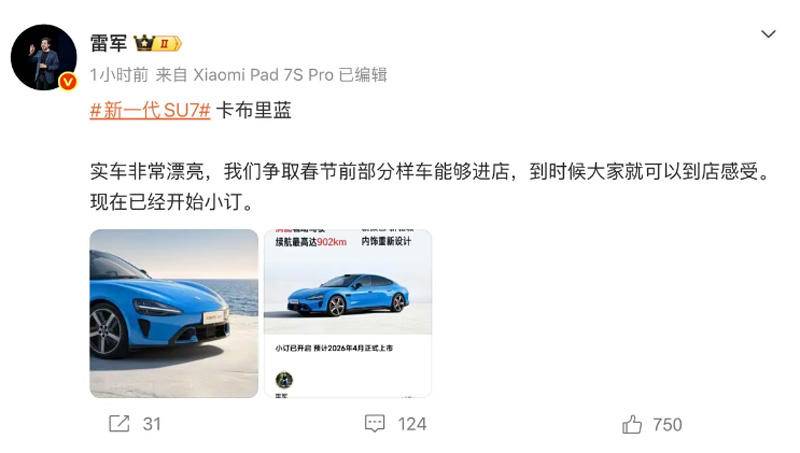 备受期待的新款小米SU7(参数|询价)何时到店?何时上市?这个问题小米CEO雷军1月25日做了回答,他称:新款SU7的卡布里蓝配色实车非常漂亮,将争取春节前部分样车进店,方便用户感受实车。”
