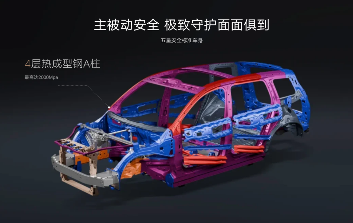 官方数据显示,整车高强度钢与铝合金占比高达90.5%,构成了一个“钢笼式”车身结构。这种不惜成本的材料应用,为乘员舱铸造了一个坚不可摧的生存空间。