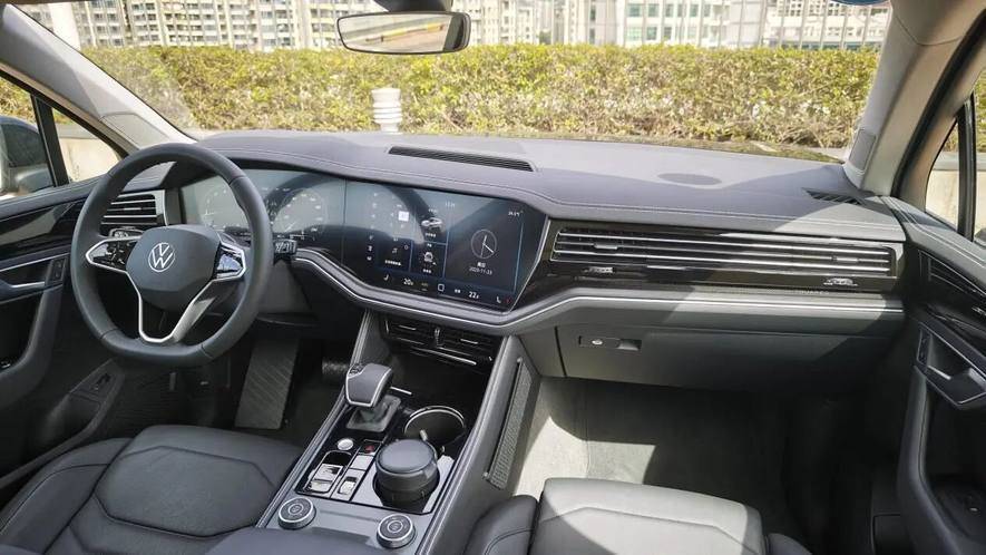 外观方面,新车配备R-Line黑化运动套件,前脸采用熏黑蜂窝状进气格栅,搭配矩阵式LED大灯与贯穿式LED灯带,辅以可点亮的“VW”品牌标识,辨识度大幅提升。车身侧面装配21英寸花瓣造型轮毂,同时对车顶行李架、车窗饰条及车尾等细节部位做黑化处理,进一步强化动感姿态。值得关注的是,受外观设计调整影响,新车车长由4878mm增加至4913mm。