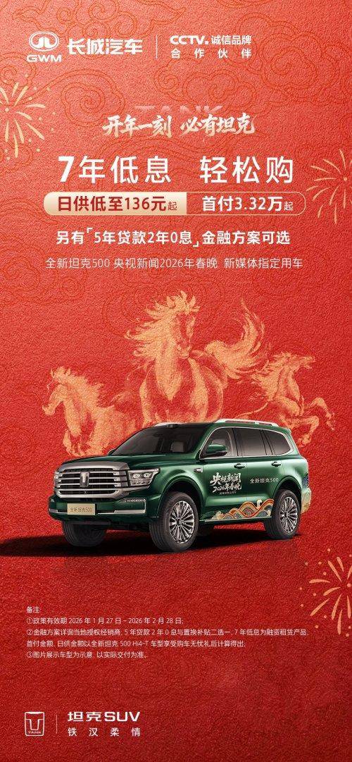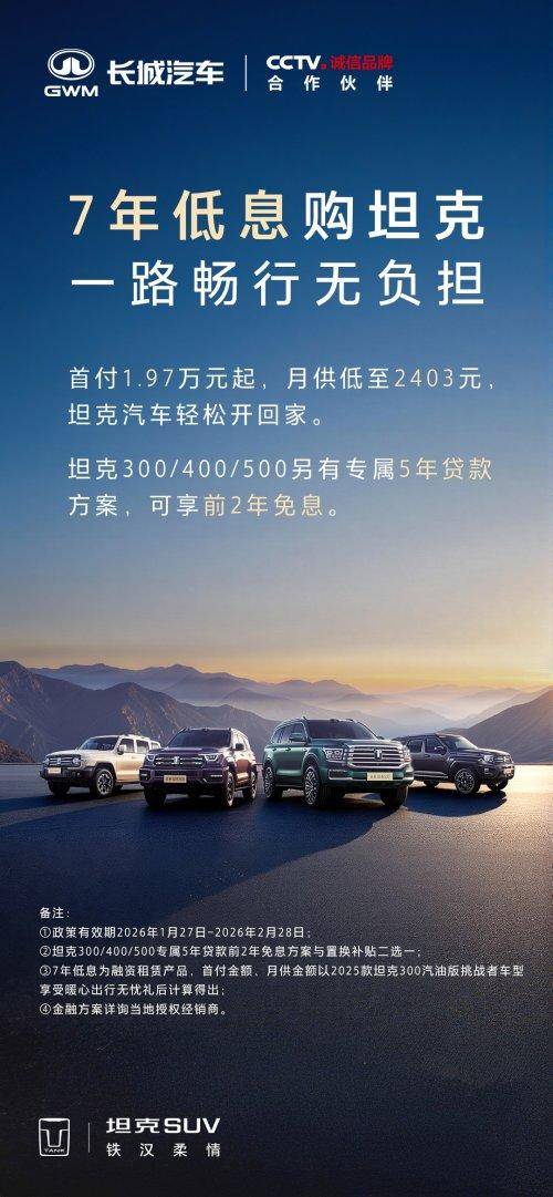 开年一刻,必有坦克。即日至2026年2月28日,坦克品牌正式推出“7年低息”和“5年贷款前2年免息”(下称“5免2”)金融购车政策,首付最低1.97万元起,日供不过百元的灵活轻松方案,助你用更低门槛,通过越野路上更高沟沟坎坎,让梦想就此轻装上路。