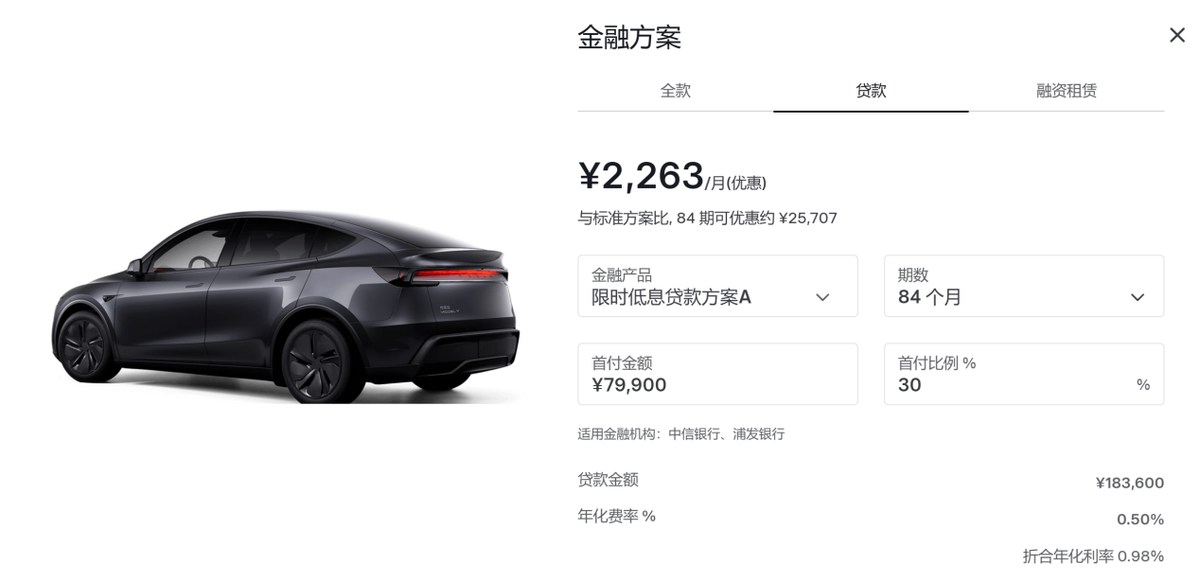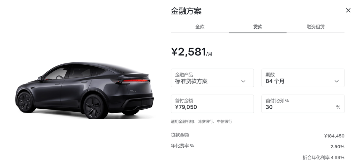 正常情况下,假设我们贷款购买一台263500元的特斯拉Model Y后轮驱动版,首付30%大概是4万元左右,然后需要贷款约22.4万元。按照现在4.69%的折合年化利率计算,如果做7年期贷款,月供2581元,总共的利息金额约3.2万元。