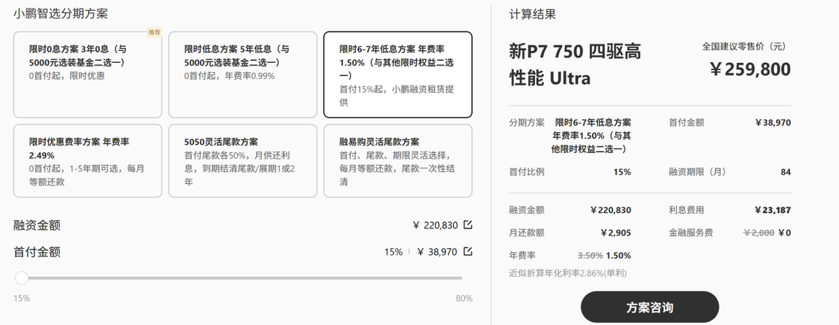 理想汽车和小鹏汽车均采用融资租赁的方式。小鹏汽车的低息方案适用于全系车型,7年购车政策要求首付至少15%,年化费率为1.5%,折合年化利率为2.86%。