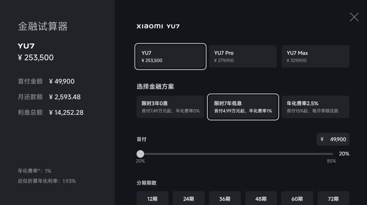 小米汽车的7年低息方案只针对YU7系列车型,要求至少首付20%,年化费率和折合年化利率分别为1%和1.93%。一台售价25.35万元的小米YU7标准版,最少需支付4.99万元首付款,月供为2593.48元,7年总利息为14252.28元,平均每年2036.04元。