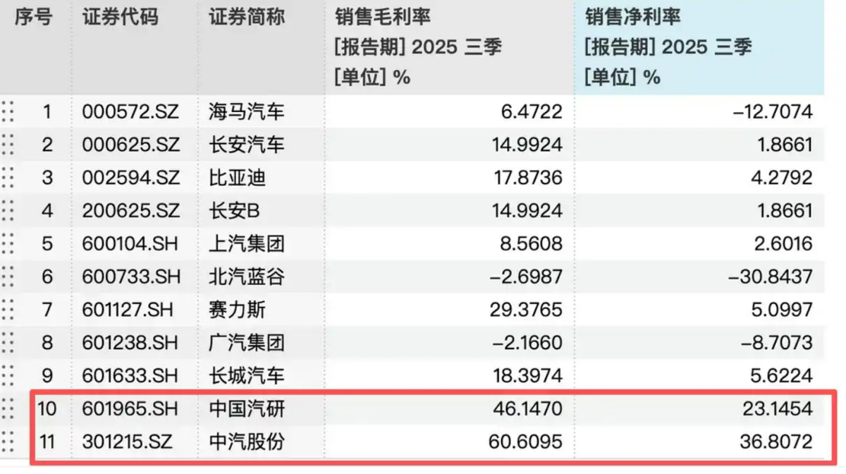 数据显示,去年三季度,中国汽研和中汽股份销售净利率分别为23.1%和36.8%。