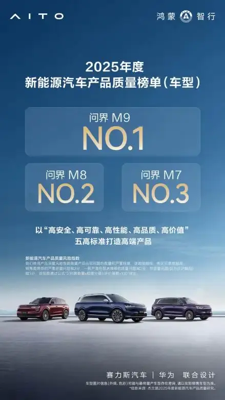 根据杰兰路最新发布的《2025年度新能源汽车产品质量研究》,在中大型及以上SUV市场,问界M7以出色的成绩排名第三,成为质量表现最为稳定的车型之一。