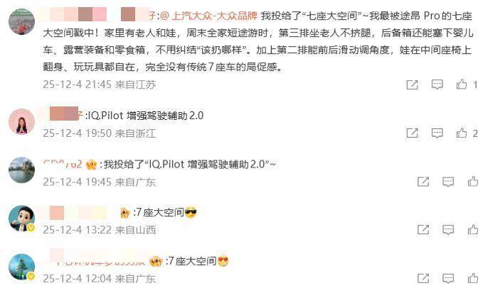 在评选互动中,“七座大空间”与“IQ.Pilot增强驾驶辅助2.0”成为网友投票关注的两大焦点。不少用户留言支持途昂 Pro的大空间:“家里有老人和小孩,周末全家出游时,第三排坐老人不挤腿,后备箱还能放下婴儿车、露营装备,不用再纠结该扔哪样。”同时,IQ.Pilot增强驾驶辅助系统2.0凭借“实时感知路况,人机共驾更安心”的出色体验,获得大量网友的选择,成为高票人气配置之一。真实用户的声音,印证了途昂 Pro在实用与科技感层面的双重吸引力。