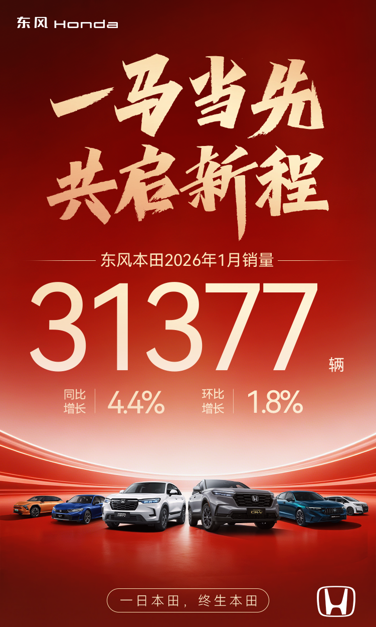 2026年,中国汽车市场进入存量竞争的深水区。在复杂的市场环境下,东风本田依托CR-V、HR-V、英仕派、思域四款王牌全球车型的持续发力,展现出了强劲的进取之势,在2026年1月实现终端销量31377台,同比增长4.4%,环比增长1.8%;同时旗下CR-V、HR-V、英仕派等主力车型均实现销量同比大幅增长。1月“开门红”的成绩在行业调整期彰显了东风本田公司体系的韧性与品牌的底蕴,为全年“固本强基、稳步上行”奠定了坚实基础。