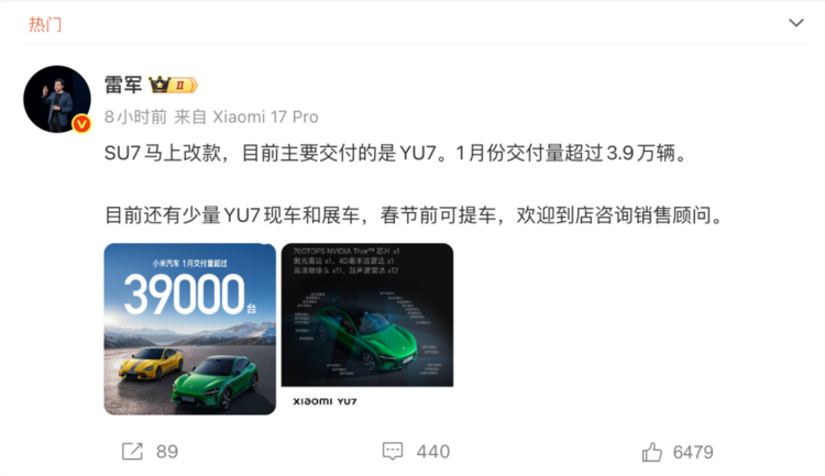 小米汽车1月交付超3.9万辆,新一代SU7上市在即!