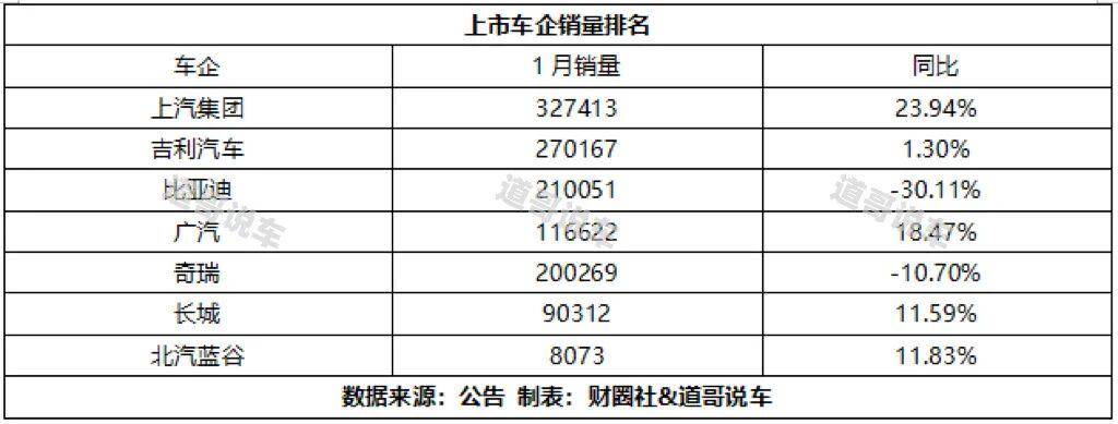 2026年1月,中国车市/上市车企中的冠军注定易主。1月,吉利汽车销量270万辆,超越比亚迪同期的21万辆。同时,上汽集团以惊人的327413辆销量,23.94%的销量增速,拿下行业第一。在此背景下,昔日销冠比亚迪,也就成为了行业第三名。