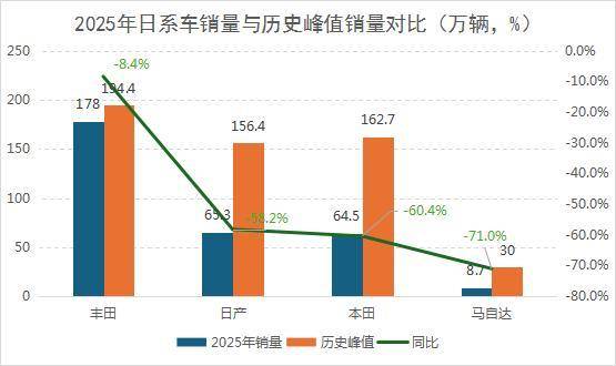 且不论早在2018年就退出中国汽车市场的铃木和2023年退出的三菱,目前在中国汽车市场的丰田、日产、本田和马自达的处境确实不妙。其中,丰田2025年在中国汽车市场的销量178万辆,较2021年历史峰值194.4万辆,下跌8.4%;日产2025年在中国汽车市场的销量65.3万辆,较2018年历史峰值156.4万辆,下跌58.2%;本田2025年在中国汽车市场的销量64.5万辆,较2020年历史峰值162.7万辆,下跌60.4%;马自达2025年在中国汽车市场的销8.7万辆,较2017年历史峰值30万辆,下跌71.0%。