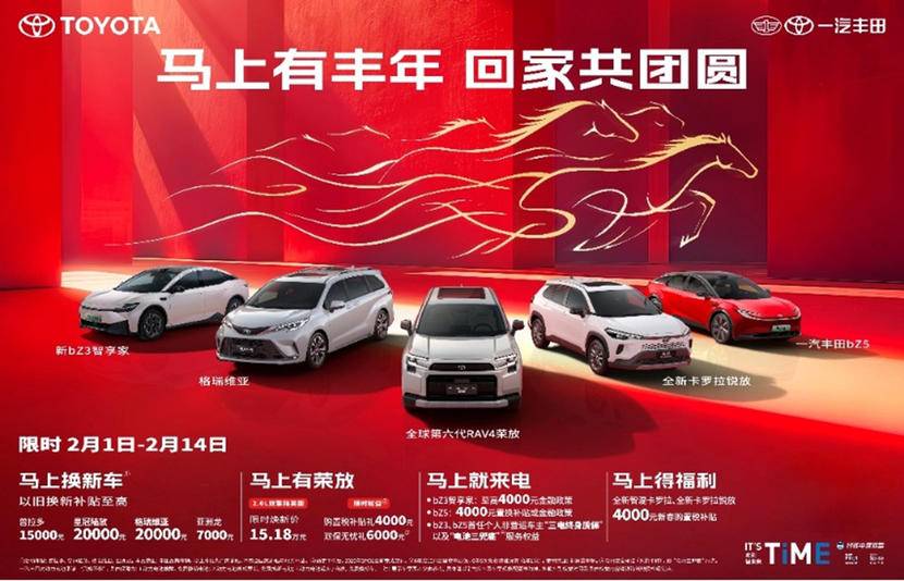 年味渐浓,归途可期。一汽丰田以一份诚挚礼遇,守护每个家庭的团圆之旅。2月1日至2月14日,一汽丰田推出限时活动,皇冠陆放(参数|询价)、格瑞维亚(参数|询价)等明星车型享至高20000元的置换补贴;全新第六代荣放限时焕新价15.18万元起,并可享4000元的购置税补贴和6000元的双保无忧礼;纯电“双子星”bZ3智享家和bZ5至高享4000元购车补贴和“三电终身质保”“电池三兜底”的服务权益;全新智混卡罗拉、全新卡罗拉锐放也可享4000元新春购置税补贴。