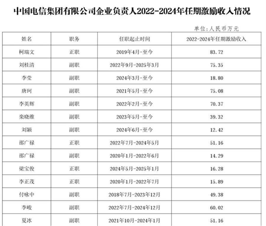 反观能源领域的央企,2022-2024年,中国石油天然气集团有限公司董事长戴厚良的任期激励收入达86.21万元,中国石油化工集团董事长马永胜的任期激励收入为84.81万元,中国海洋石油集团有限公司董事长汪东进的任期激励收入为86.06万元,均高于邱现东,更远超杨青的合计收入。通信领域的中国电信集团有限公司,正职负责人柯瑞文的任期激励收入为83.72万元,与邱现东基本持平,而副职负责人中,刘桂清、唐珂的任期激励收入分别为75.35万元、75.08万元,也已接近甚至超过杨青的合计收入。