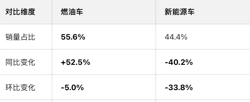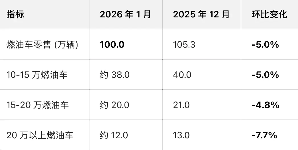 那这么说燃油车反而站起来了,其实并没有,1月销量100.0 万辆,环比还少了5%,只是新能源下滑太猛,显得燃油车“没那么惨”而已,整体市场还是疲软。
