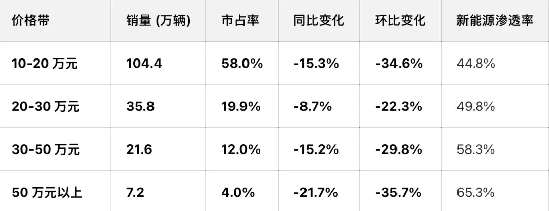 第二个信号,品牌高端化,成了车企的“防弹衣”,25万以上的新能源车,卖得依然稳,20-30万新能源渗透率还能维持在50%,30万以上新能源渗透率继续在高点,近60%。